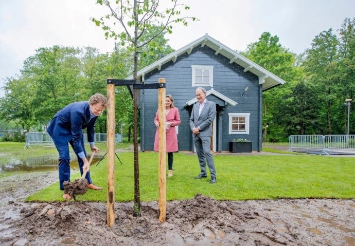 Photo: Daan Schut (CTO Alliander), Paul Hesselink (CEO Kiwa) and Annemarie Brüning (host) performing the opening of the Hydrogen Demo House by planting a Tilia hydrogenia linden tree.