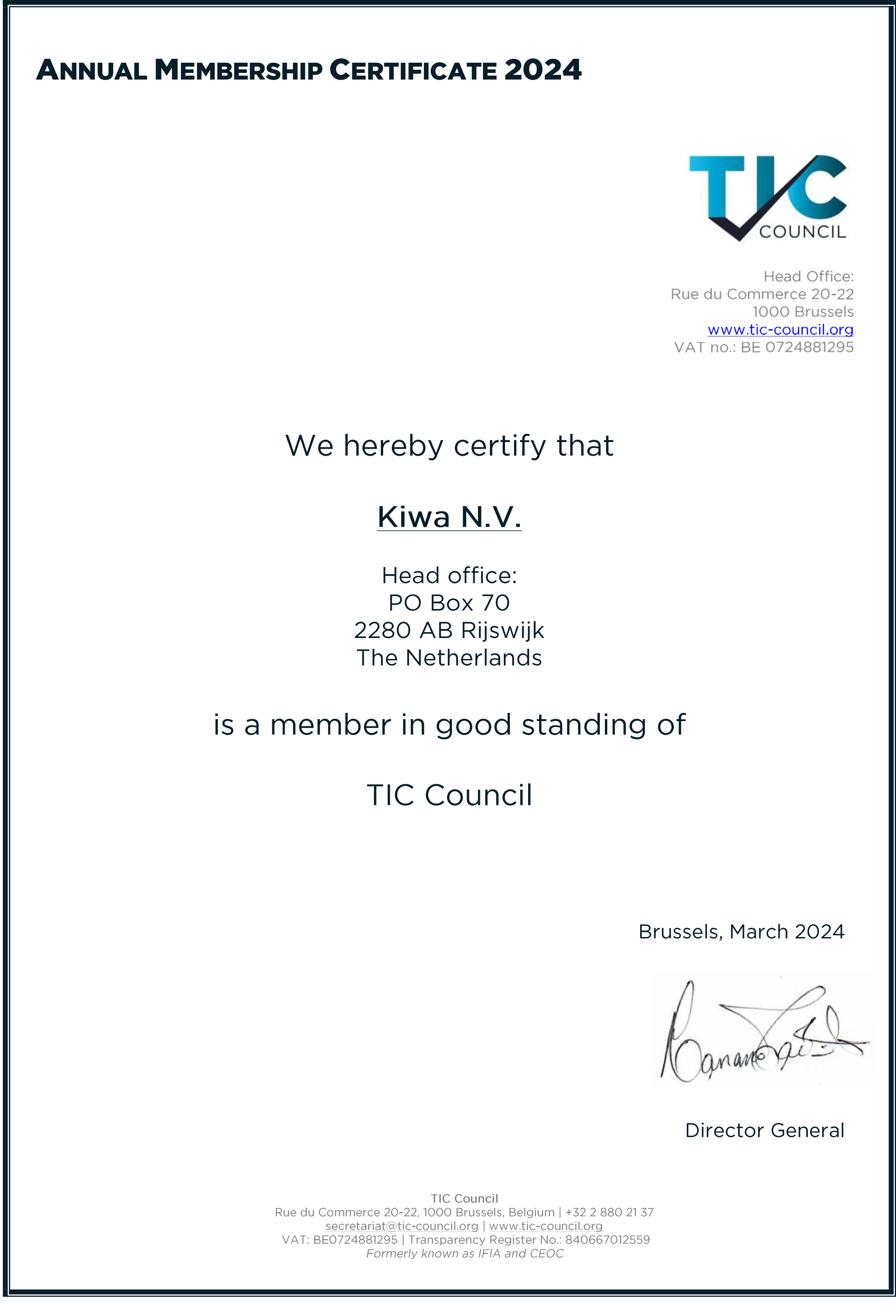 We're proud to announce that Kiwa has received its annual membership certificate by the TIC Council, the international umbrella organization of well-reputed TIC companies.