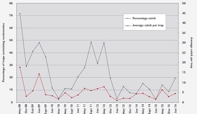 The black plot line shows the proportion of the monitors that have caught cockroaches (a measure of their distribution), whilst the red line shows the numbers caught (a measure of the degree of infestation). What was an extremely heavy infestation in 2008 has been reduced to a much lower level now (eradication is probably impossible at this site). The ‘blip' in late 2011 was caused by poor performance from the incumbent pest control contractor, and resulted in them being replaced.