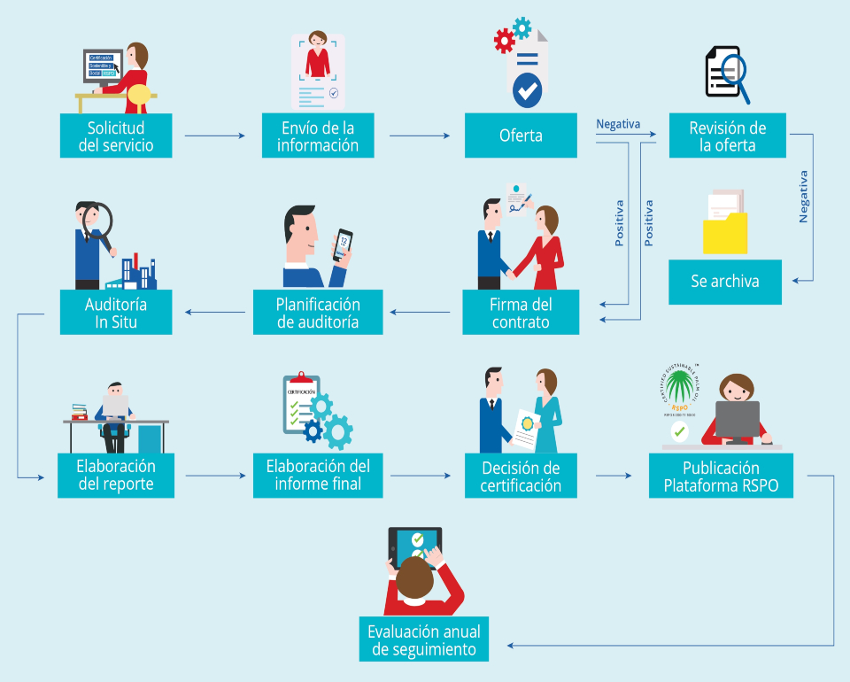 La persona o empresa investiga sobre el servicio de certificación y envía información general del proyecto para que Kiwa BCS pueda emitir una oferta, si la oferta es positiva se procede a la firma del contrato; y si es negativa es necesario revisarla de nuevo y tomar una decisión si se archiva o continua el proceso. Después de la firma del contrato se planifica la auditoría y se procede con la revisión documental. Durante la ejecución de la auditoría in situ se hace consultas a las partes interesadas (esto aplica solo para auditorías iniciales y de recertificación); se procede a elaborar un reporte con los hallazgos encontrados u observaciones, este es enviado como informe final a la RSPO, quienes proceden con la evaluación y publicación. Si todo está correcto se otorga el certificado a la empresa y se planifican fechas de evaluaciones anuales de seguimiento.