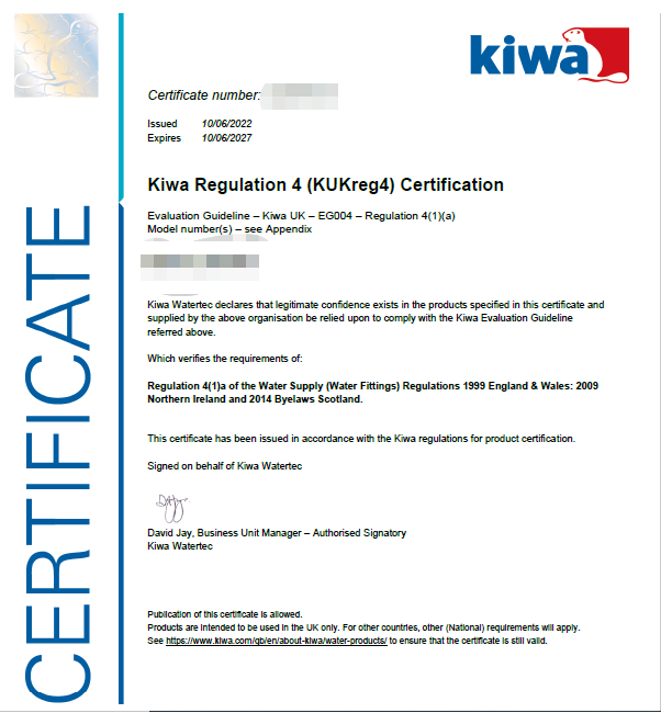 KIWA KUK Regulation 4证书:在英国,管控饮用水线上产品的是英国水务法规的第四章节,众所周知,一直以来WRAS是最简单证明其产品满足英国水务法规的证书,但容易受WRAS的PAG会议审核制度和海外测试的限制,从而导致取证周期过长,送样不够便利等影响客户下单以及出货,于是KIWA推出KUK Regulation 4饮用水证书,其测试的标准和WRAS一致,只是发证机构不同,但由于可以在KIWA广州实验室完成测试,而且没有PAG会议的审核制度,从而加快了取证的速度和认证的便利性。