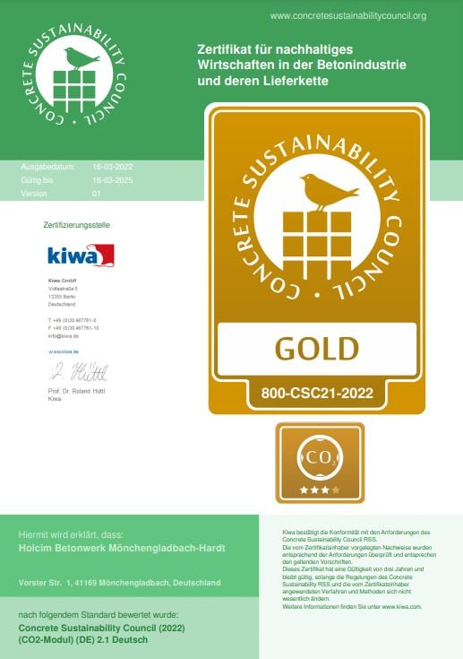 Das Holcim Transportbetonwerk in Mönchengladbach-Hardt wurde als erstes Unternehmen weltweit von Kiwa am 16. März 2022 nach dem CSC CO2-Modul zertifiziert – ein Zertifikat, das erst sein Januar 2022 überhaupt ausgestellt wird.