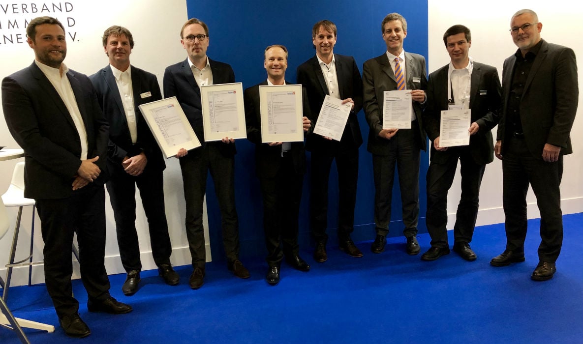 Photo: First certificates handed over to Wavin, REHAU and Uponor. From left to right: Dragan Jovanov and Ronald Karel (Kiwa), Jan Elenbaas (Wavin Group B.V.), Jan Molterer and Horst Stimmelmayr (REHAU AG + Co), Joachim Rau (DVGW CERT GmbH), Markus Bohl (Uponor GmbH) and Volker Meyer (European Drinking Water (EDW).