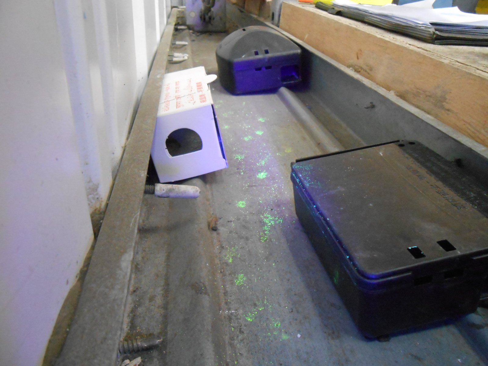 The photo above vividly demonstrates the avoidance of bait stations and trapping boxes by mice, which we observed when we tested the efficacy of these against remote rodent monitoring devices. The green footprints are actually a non-toxic dust which fluoresces under UV light, and highlight that mice were running around and over devices that had been placed to control them.