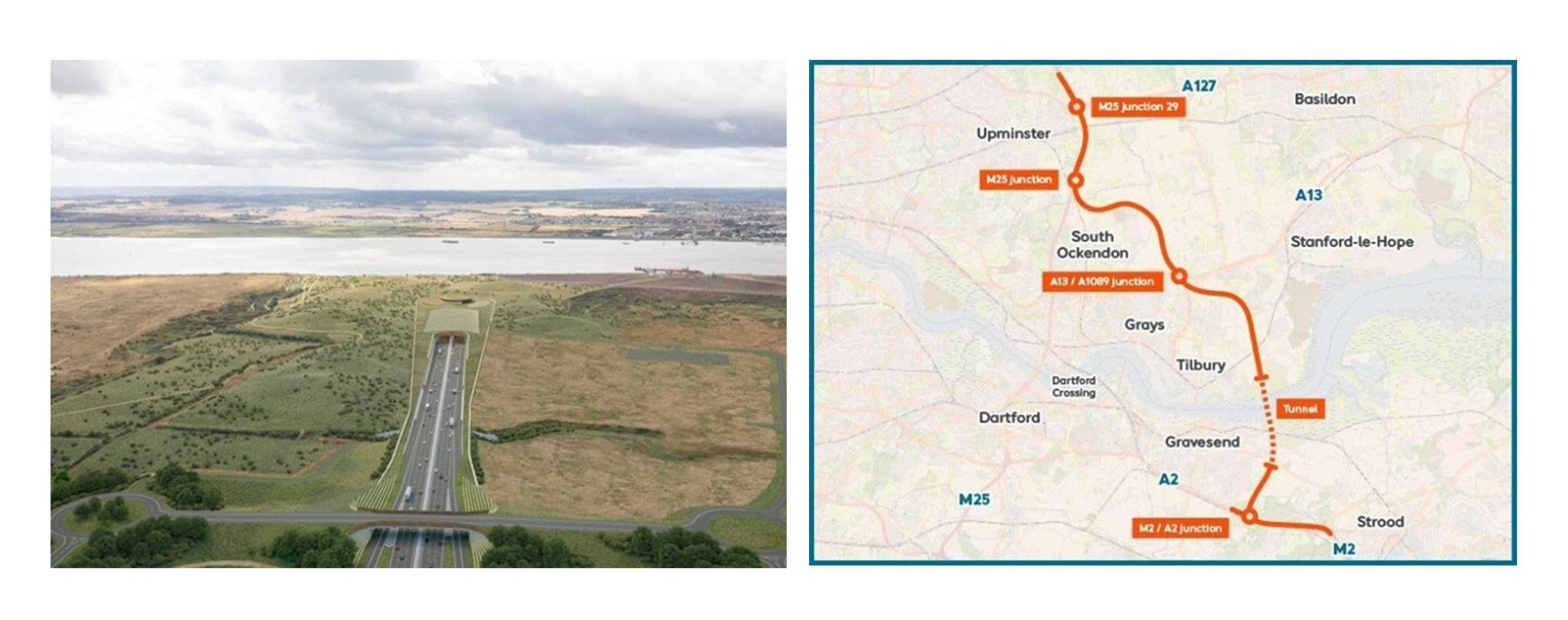 The Lower Thames Crossing is a planned road crossing of the Thames estuary downstream of the Dartford Crossing that would link the English counties of Kent and Essex, and its proposed approaches. When built, the crossing will have the longest road tunnel in the UK at 2.6 miles, with around 14 miles of new approach roads. The overall projects costs for the project are approximately £10.6 billion and it is expected to take six years to build.