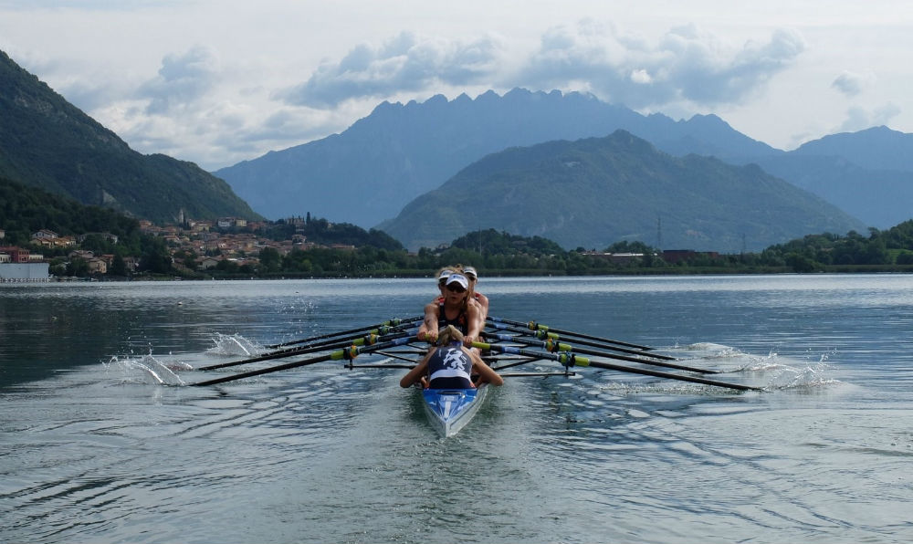The Dutch Women's Eight rowing ladies together with Kiwa's George Mentjox and Charlotte Geers during their training camp in Italy, August 2019.