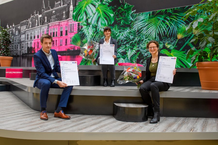 Photo: Kiwa’s André Schoonhoven presents the ISO 9001, ISO 14001 and ISO 27001 certificates to Aynur Balkan and Alie Rozendal of T-Mobile Netherlands.