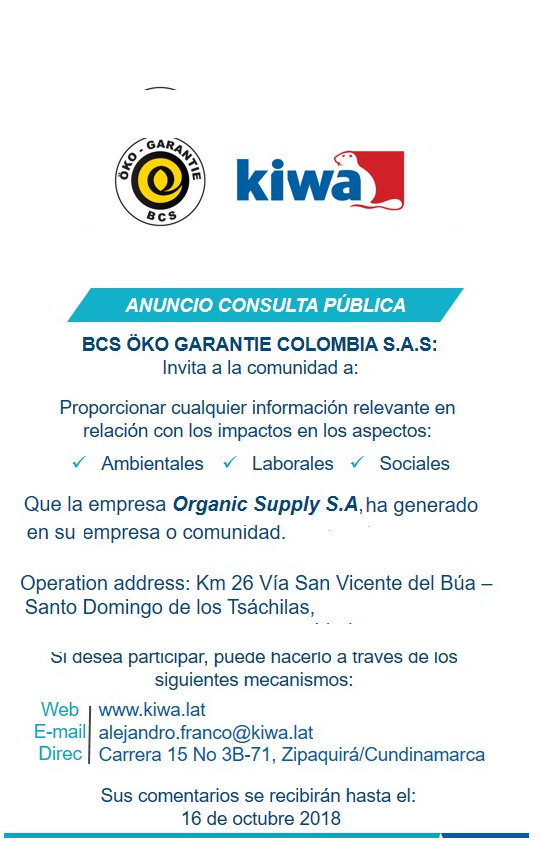 BCS ÖKO GARANTIE COLOMBIA S.A.S de acuerdo a lo previsto en el proceso de certificación RSPO (Mesa Redonda de Aceite de Palma Sostenible), por sus siglas en inglés; pone en su conocimiento el proceso de Consulta Pública, el cual abre la posibilidad a las partes interesadas, relacionadas o afectadas por la empresa Organic Supply S.A.