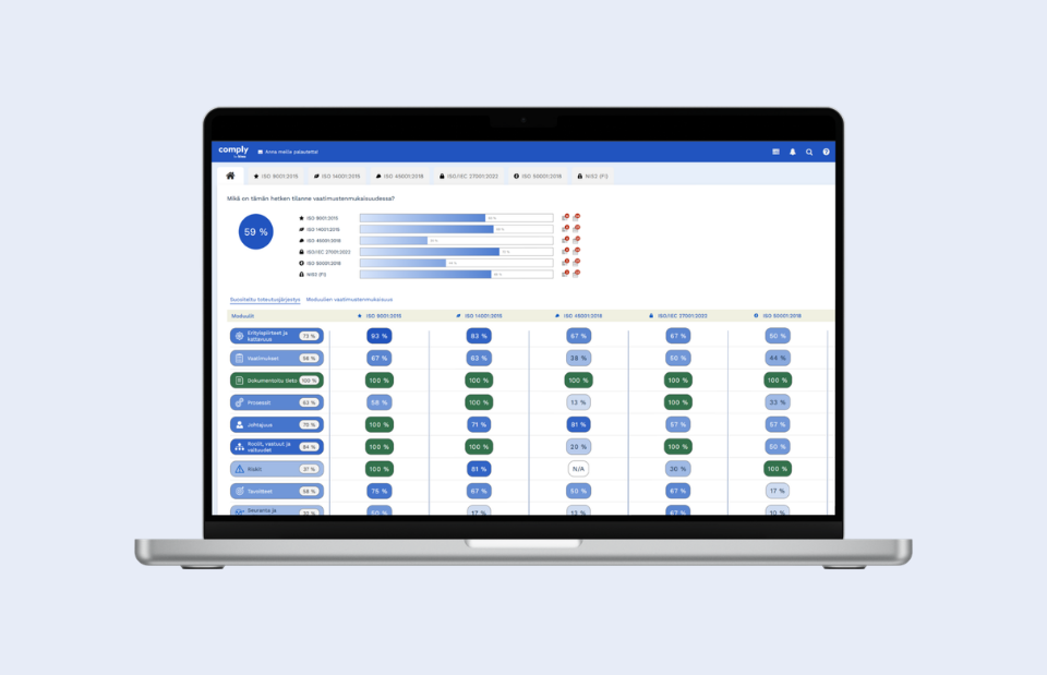 Kiwa Comply™ also integrates different management systems, such as ISO 9001 and ISO 14001, into one comprehensive system, reducing redundant work and streamlining company data management. Laura Lindholm, Business Development Manager at Kiwa Impact Oy, notes that the product range of the software is constantly expanding, with new standards such as ISO 50001 and ISO 45001 being added in the near future.