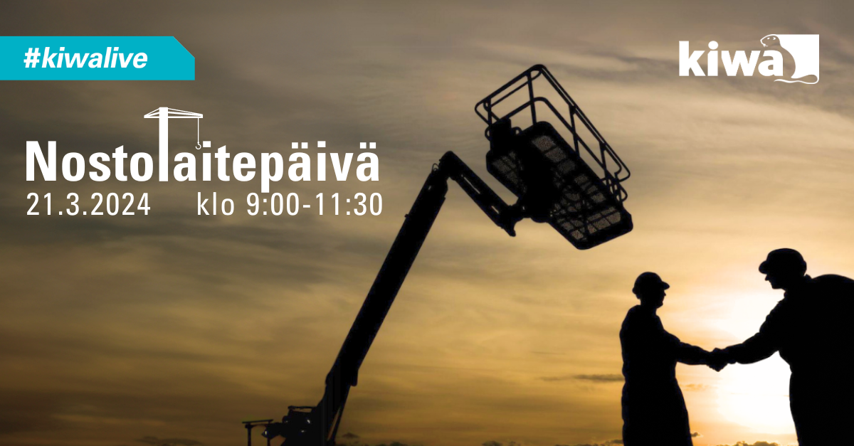 Nostolaitepäivä Kiwa Live on koko alan yhteinen virtuaalitapahtuma, joka käsittelee ajankohtaisia aiheita ja näkökulmia. Suora lähetys käynnistyy 21.3.2024 klo 9:00 ja kestää n. klo 11:30 asti. Päivän aikana kuulemme asiantuntijapuheenvuoroja nostolaitteiden ajankohtaisten teemojen ympäriltä.