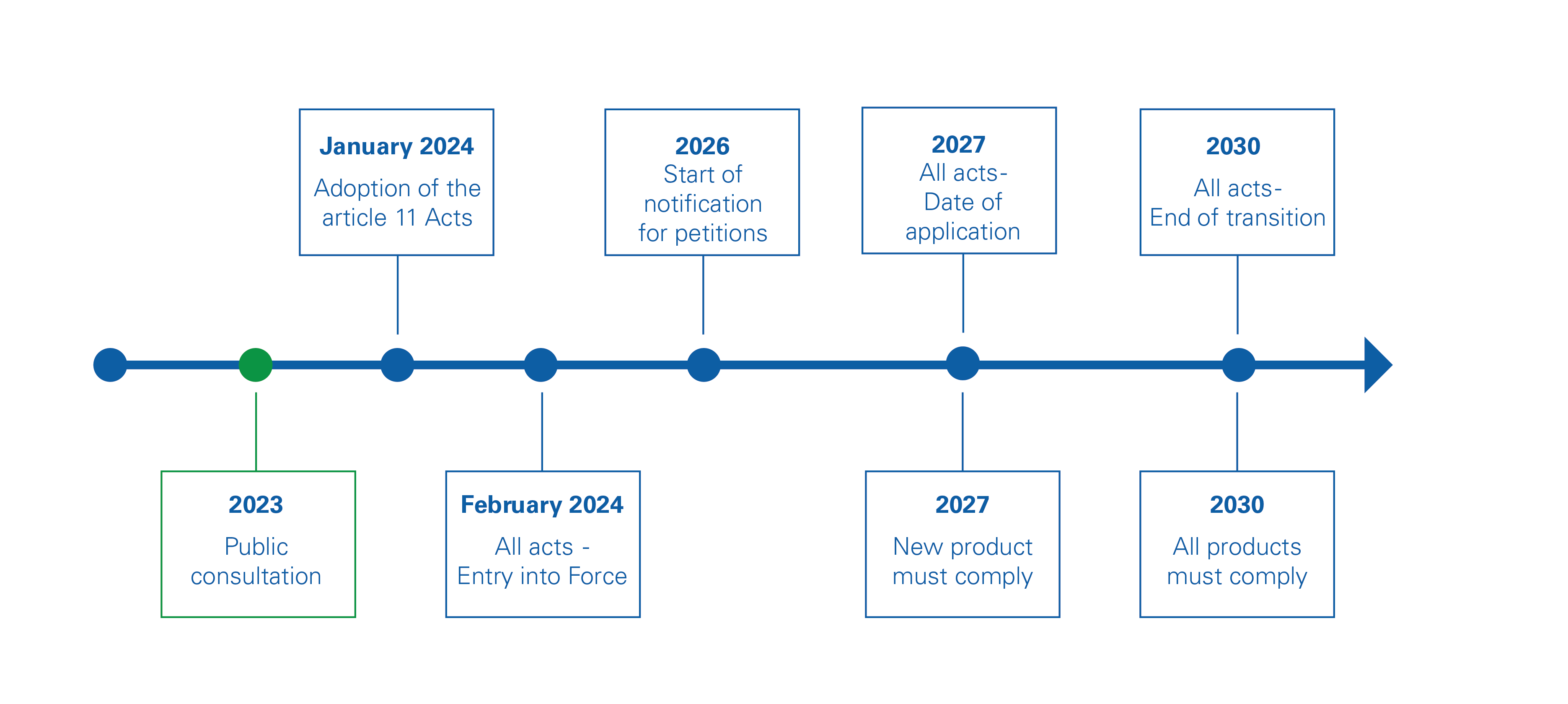 With the entry into force of the Acts, the transition of the current situation of national approvals will transition into the EU system. Starting in 2027, products entering the EU market will need to comply. Products with existing national approvals have until 2030 (or possibly 2032) to comply.
