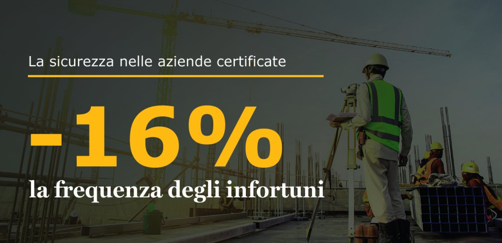 Lo studio condotto da Inail per l’Osservatorio Accredia “La sicurezza sui luoghi di lavoro e la certificazione” ha confrontato gli indici infortunistici delle aziende certificate con i dati delle aziende non certificate, nei diversi settori identificati come Grandi Gruppi di tariffa Inail. Lo studio sottolinea l’importanza della Certificazione, ovvero, il livello di sicurezza certificato comporta un calo del numero di infortuni del 16% e una riduzione della loro gravità del 40%.