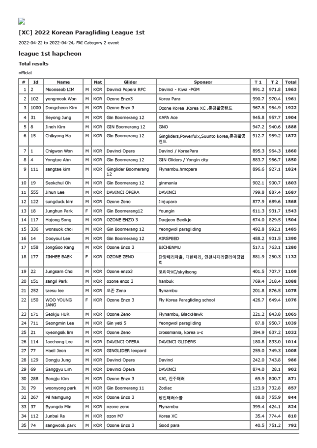 키와코리아 후원하고 있는 임문섭 선수가 "한국 패러글라이딩 리그 1차전 라이브 트래킹"에서 종합 1위를 차지 하였습니다.