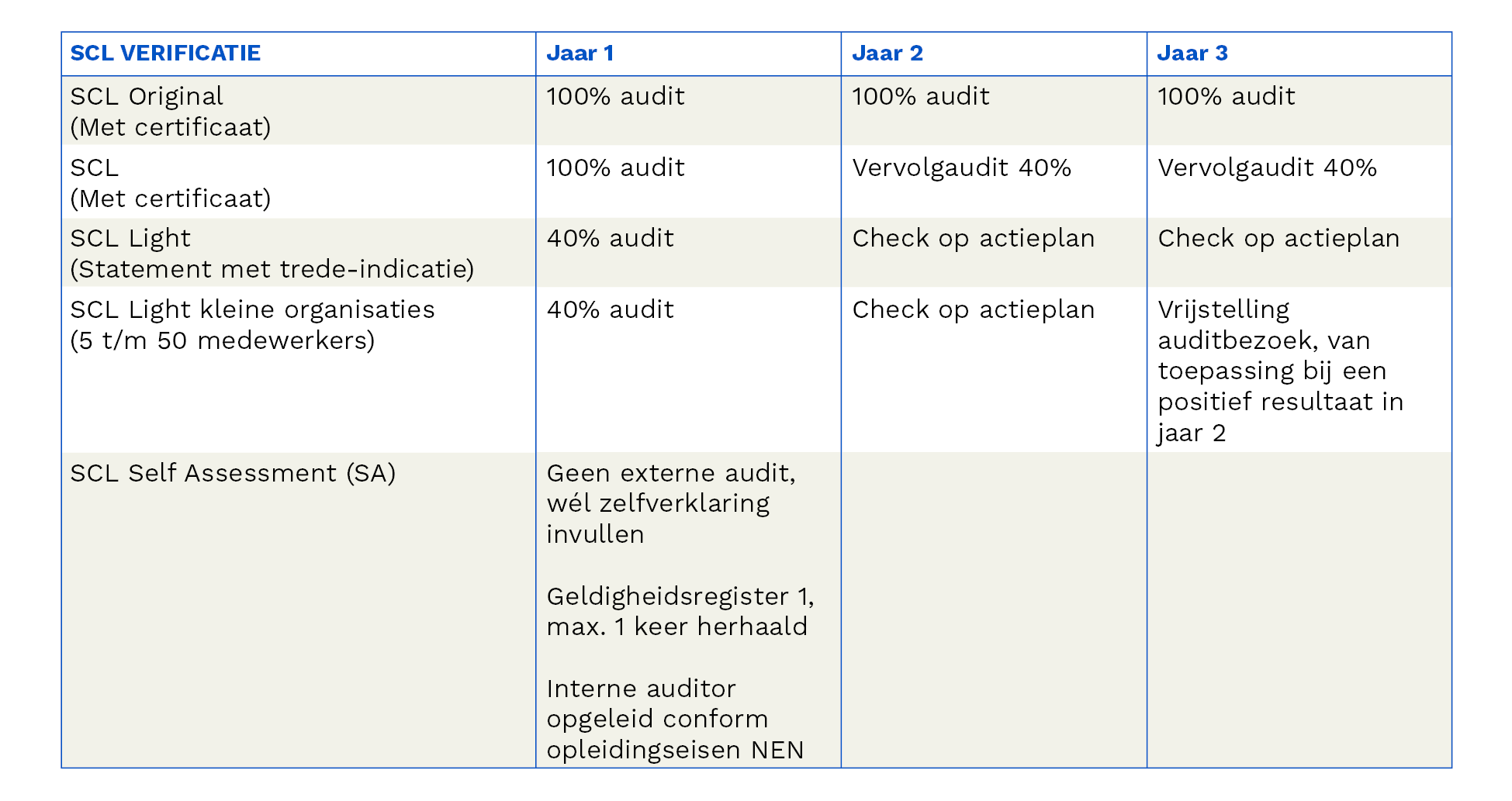 In onderstaand overzicht vindt u een compleet overzicht van de beschikbare SCL-producten. Het aanbod loopt uiteen van de SCL Original (waarbij elk jaar de volledige audit plaatsvindt) tot een Light variant voor kleinere organisaties en een Self Assessment dat uw organisatie helpt om laagdrempelig met SCL kennis te maken. Kiwa kan al deze producten certificeren en u helpen een keuze te maken voor een bepaalde SCL-variant.