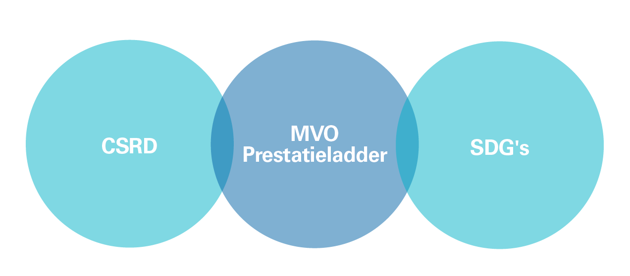 De thema’s in de MVO Prestatieladder zijn gekoppeld aan de SDG’s én aan de invulling van de CSRD: de European Sustainability Reporting Standards (ESRS). Hiermee geeft u met één systeem invulling aan rapportage-eisen vanuit verschillende perspectieven.