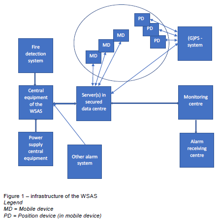 Dit schema beschrijft dan ook hoe een draadloos stil alarm systeem op basis van een ICT-structuur in een “Hosted Solution”. De oplossing “Hosted Solution” is beschreven in EN50136-1/A1 en zorgt dat de dienst is georganiseerd vanuit een datacenter met hoge beschikbaarheid, integriteit en vertrouwelijkheid. De verbindingen van dit datacenter naar het beveiligde gebouw voldoen aan dezelfde hoge eisen. In het beveiligde gebouw zijn standaard “mobile devices” aanwezig die communiceren in een redundant netwerk binnen het gebouw en die de dienst mogelijk maken.