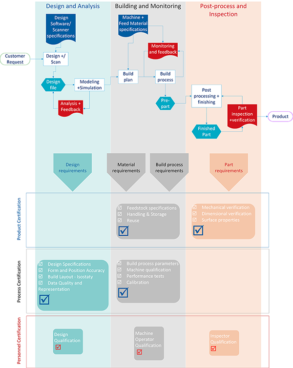Additive manufacturing processes can be divided into stages such as design, material feed, building, post processing and inspection. These stages can be parts of one production line or function cooperatively as independent production units in a digital ecosystem.
