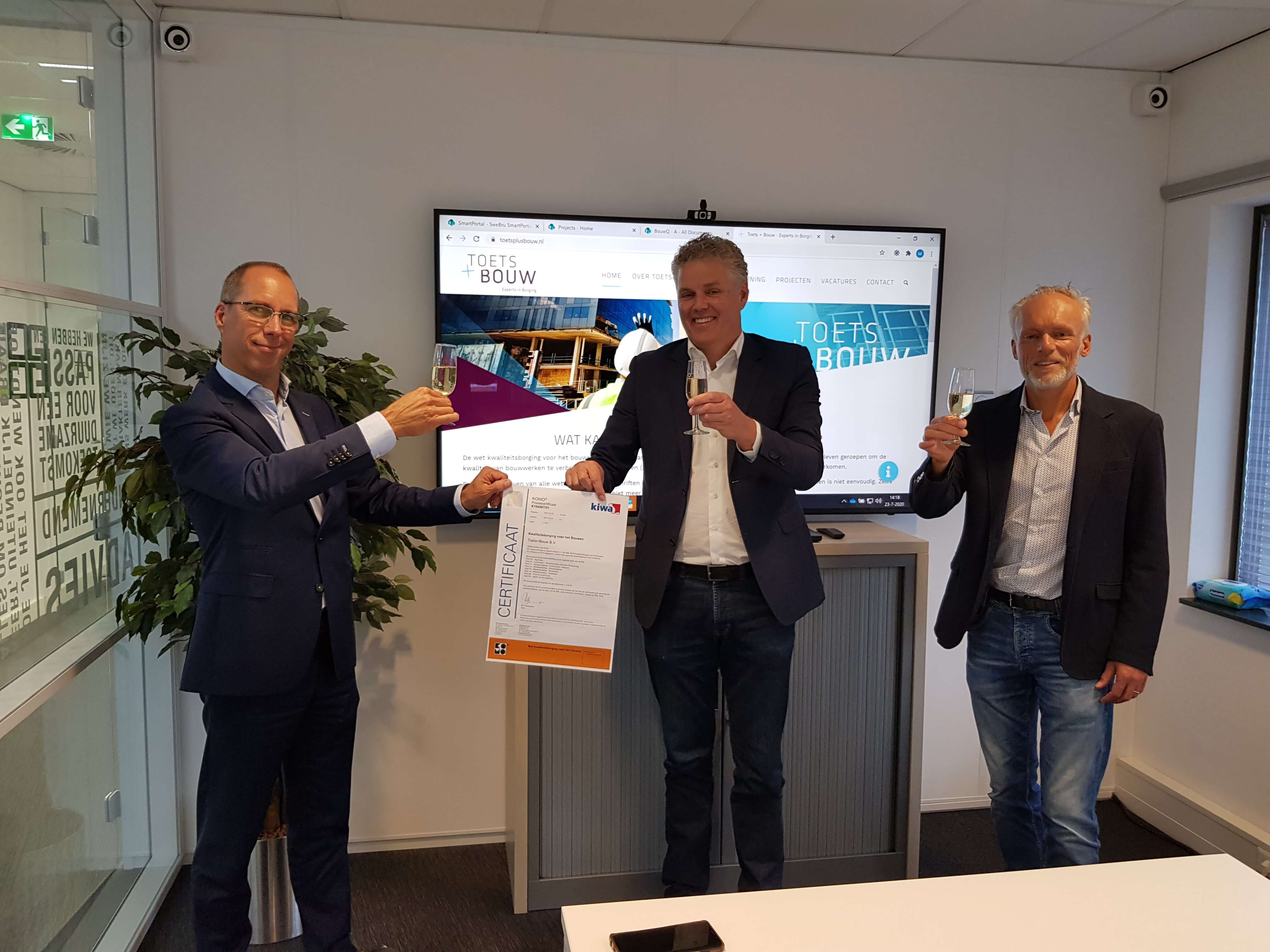 Hoewel nog onzeker is wanneer de Wet Kwaliteitsborging (Wkb) exact in werking treedt, besloot Toets+Bouw nú al te gaan voor certificering volgens het KOMO-procescertificaat BRL 5019 ‘Kwaliteitsborging voor het bouwen’. De Bossche kwaliteitsborger ontving het certificaat op 23 juli 2020 uit handen van Jan Koers, programmamanager Wkb bij Kiwa.