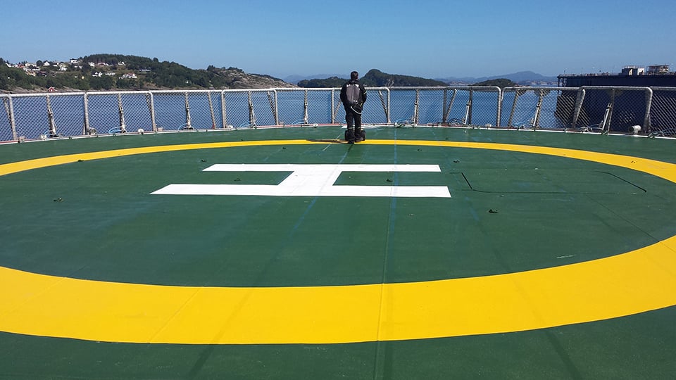 Det er strenge krav til friksjon mellom helikopter og helikopterdekk på fartøy og offshore-installasjoner. Serviceingeniør Jan Ove Risa ved Kiwa tar i bruk avansert utstyr for å kontrollere at kravene blir oppfylt.