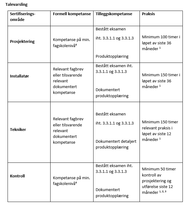 For personellsertifisering innen disse områdene må kravene i FG-750:2 avsnitt 2.4 tabell 2 være oppfylt. Se vedlegg.