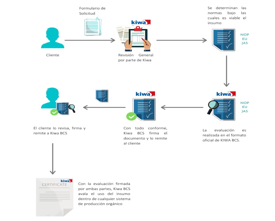 Kiwa BCS ofrece la Evaluación de Insumos Agrícolas aptos para la Agricultura Orgánica bajo las normas de la Unión Europea, Estados Unidos y Japón. El proceso para iniciar con la certificación es muy sencillo y se lo detalla de la siguiente manera: