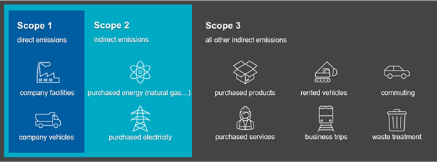 ISO 14064'e göre Kurumsal Karbon Ayak İzi (CCFP) üç kapsama ayrılmıştır. Kapsam 1, şirketin araçlarından ve tesislerinden kaynaklanan doğrudan emisyonları .içerir. Kapsam 2, ithal edilen enerjiden, yani elektrikten kaynaklanan dolaylı emisyonları içerir. Kapsam 3'te, diğer tüm dolaylı emisyonlar dikkate alınır.