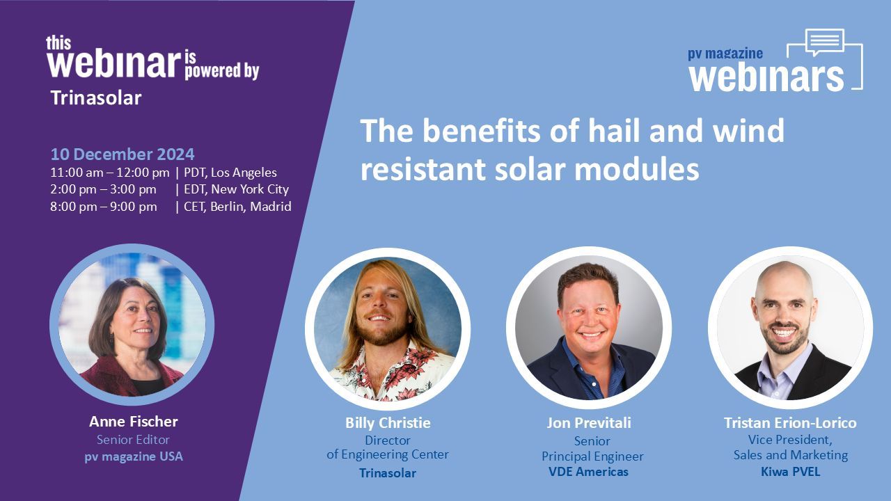 Dec 10, 2024. In this pv magazine Webinar, Kiwa PVEL joins other experts to discuss what increasing weather events mean for the solar industry including the benefits of hail-and-wind-resistant modules from a utility, C&I, community solar perspective, as well as from a residential homeowner and installer perspective.