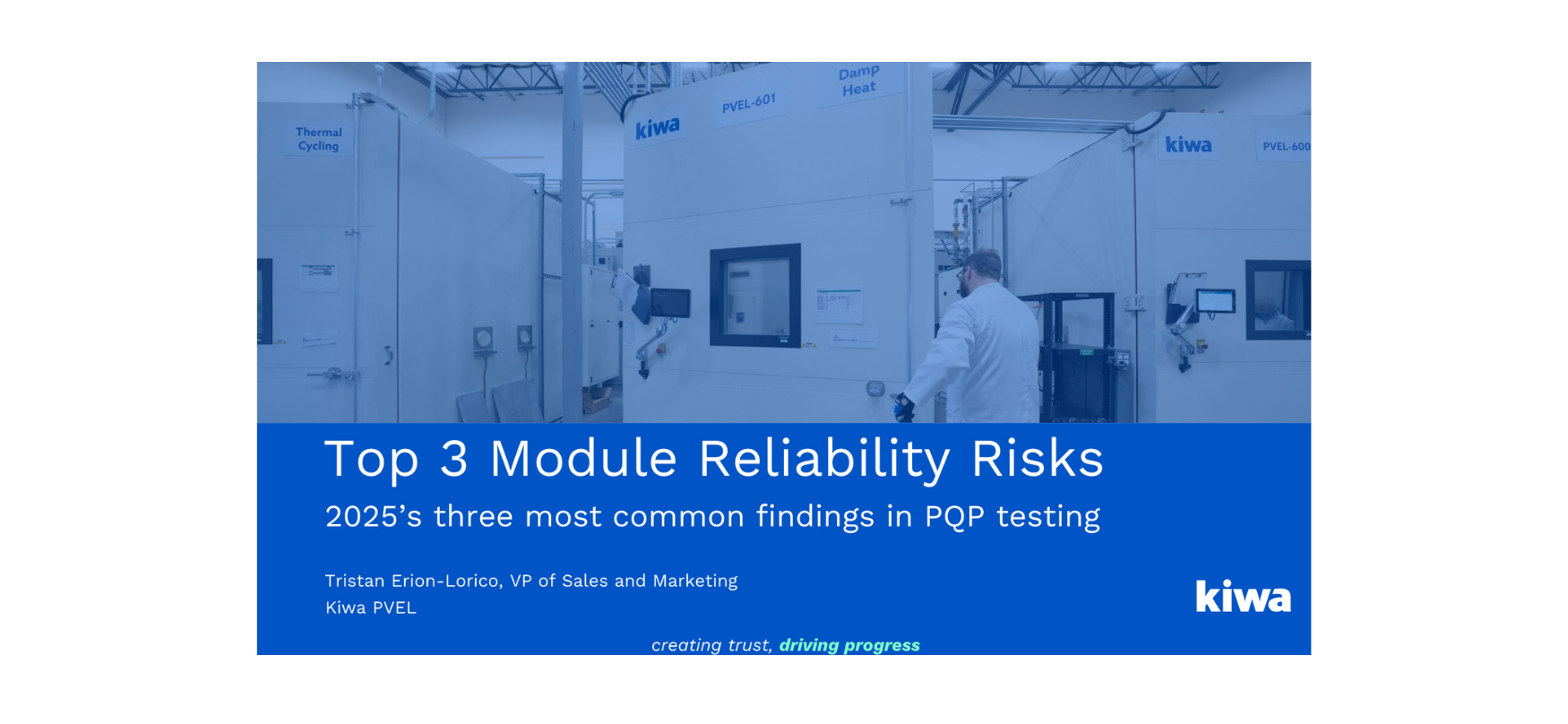 Dec 3, 2025. At the 2025 PV ModuleTech Europe this December, Tristan Erion-Lorico, VP of Sales and Marketing at Kiwa PVEL, shared insights on how quality, traceability, and reliability issues are impacting the market for PV modules. He discussed how emerging technologies like TOPCon and HJT exhibit wide variability in susceptibility to UVID, while mechanical stress failures and glass breakage have risen sharply with new module designs. The presentation emphasized that data-driven testing, BOM-level transparency, and traceability are essential for buyers to manage risk and ensure long-term module reliability in an increasingly cost-pressured market