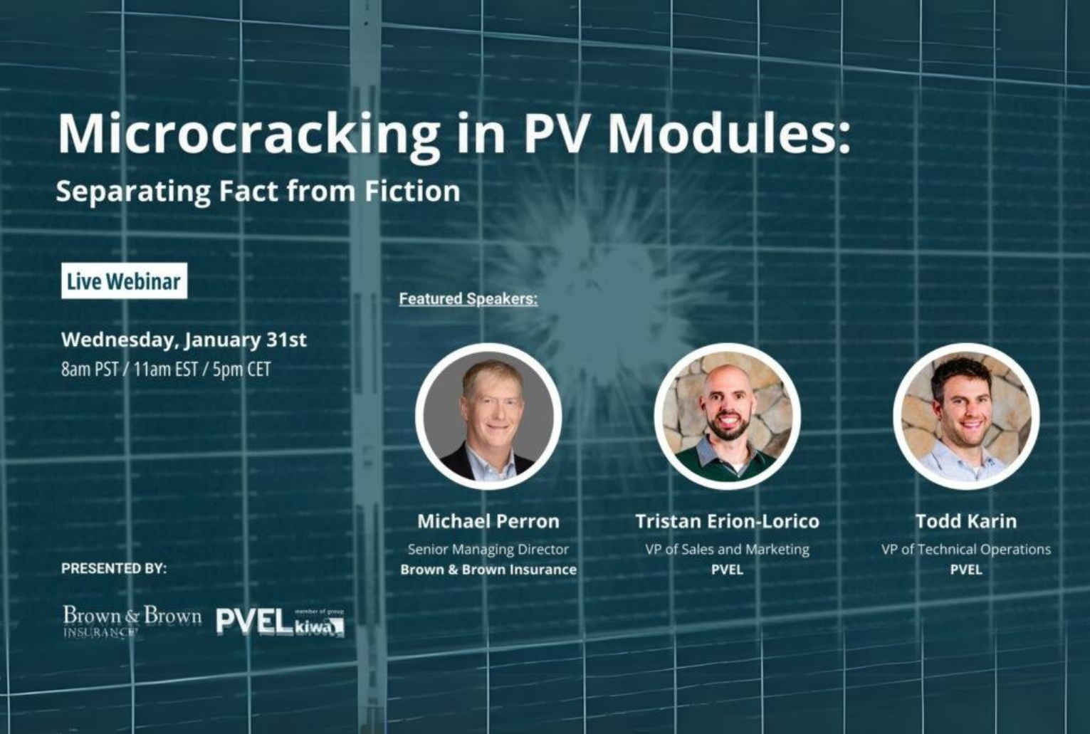 January 31, 2024. In this webinar, experts from PVEL and Brown & Brown Risk Solutions provided an overview of microcracking risks, including the current challenges for developers and insurers, along with insights and the latest results from Kiwa PVEL’s extended reliability testing. An overview of insurance claims related to cell cracks and limitations for insurance coverage was also presented.